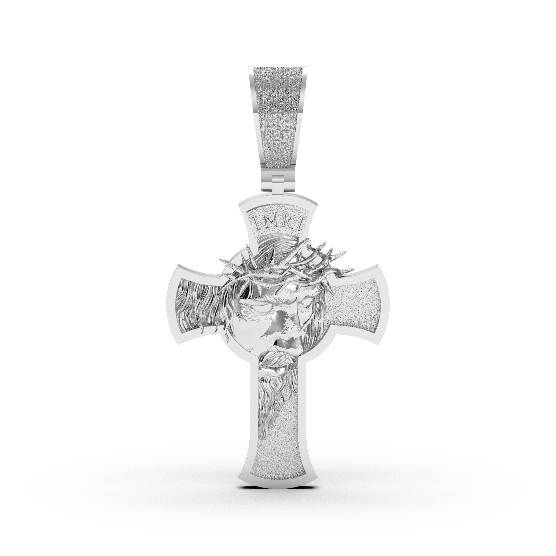 Wear a profound symbol of faith, sacrifice, and love with this powerfully designed cross pendant. Masterfully crafted from solid 925 sterling silver, this piece features a detailed face of Jesus, crowned with thorns, at the center of a classic cross. The entire surface of the cross and the bail are given a rugged, 'iced out' texture, which makes the polished details of Jesus's face and crown of thorns stand out with striking contrast. ✨