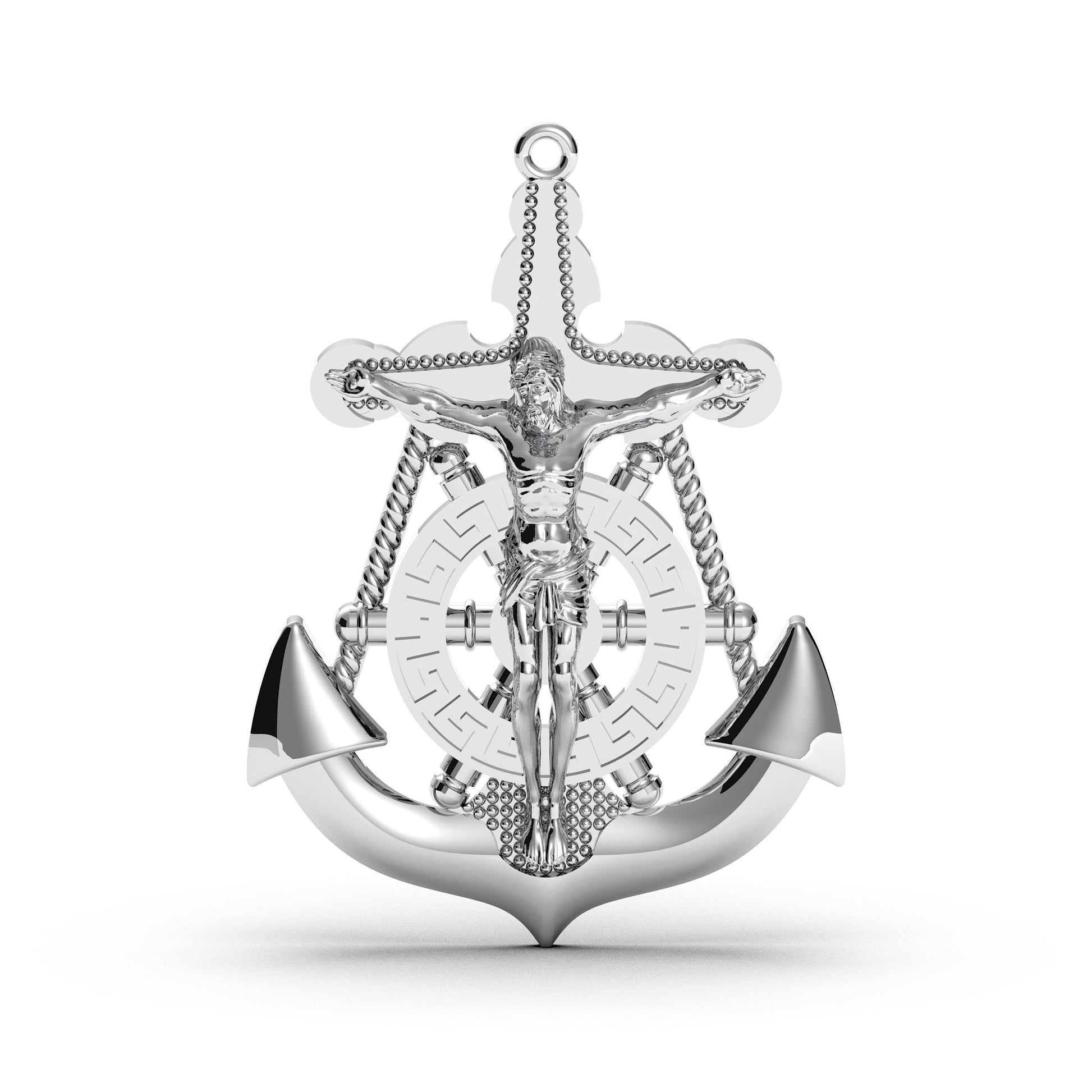 Anchor your faith with this powerful and deeply symbolic Mariner's Cross pendant. Masterfully crafted from solid 925 sterling silver, this piece beautifully merges the steadfastness of the nautical anchor with the devotion of the Christian crucifix. A detailed figure of Jesus Christ is centered on the cross, which is formed by a ship's helm and a sturdy anchor, symbolizing hope, salvation, and unwavering faith through all of life's journeys. ✨