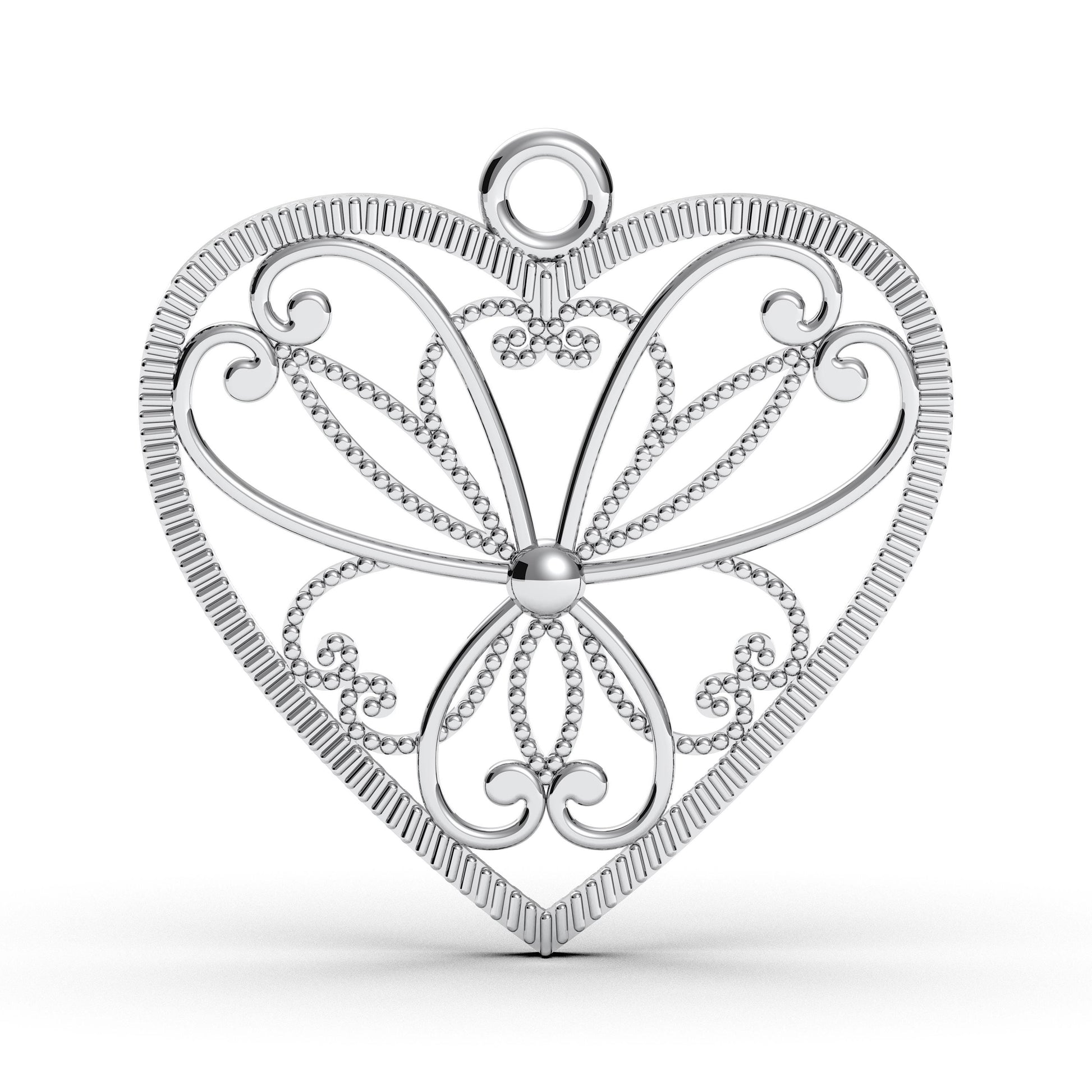 - Design: An openwork heart featuring a central filigree butterfly and a textured border.